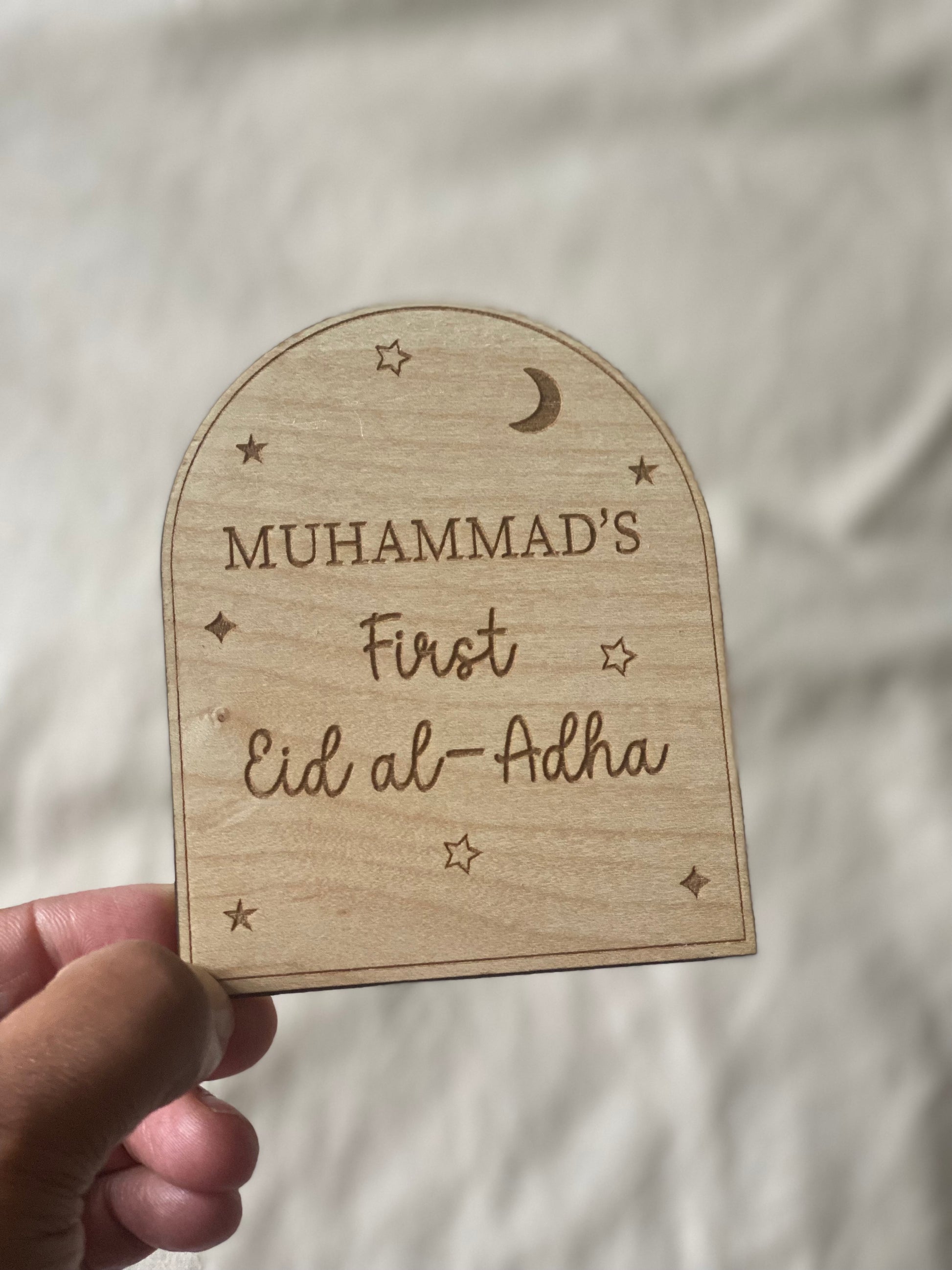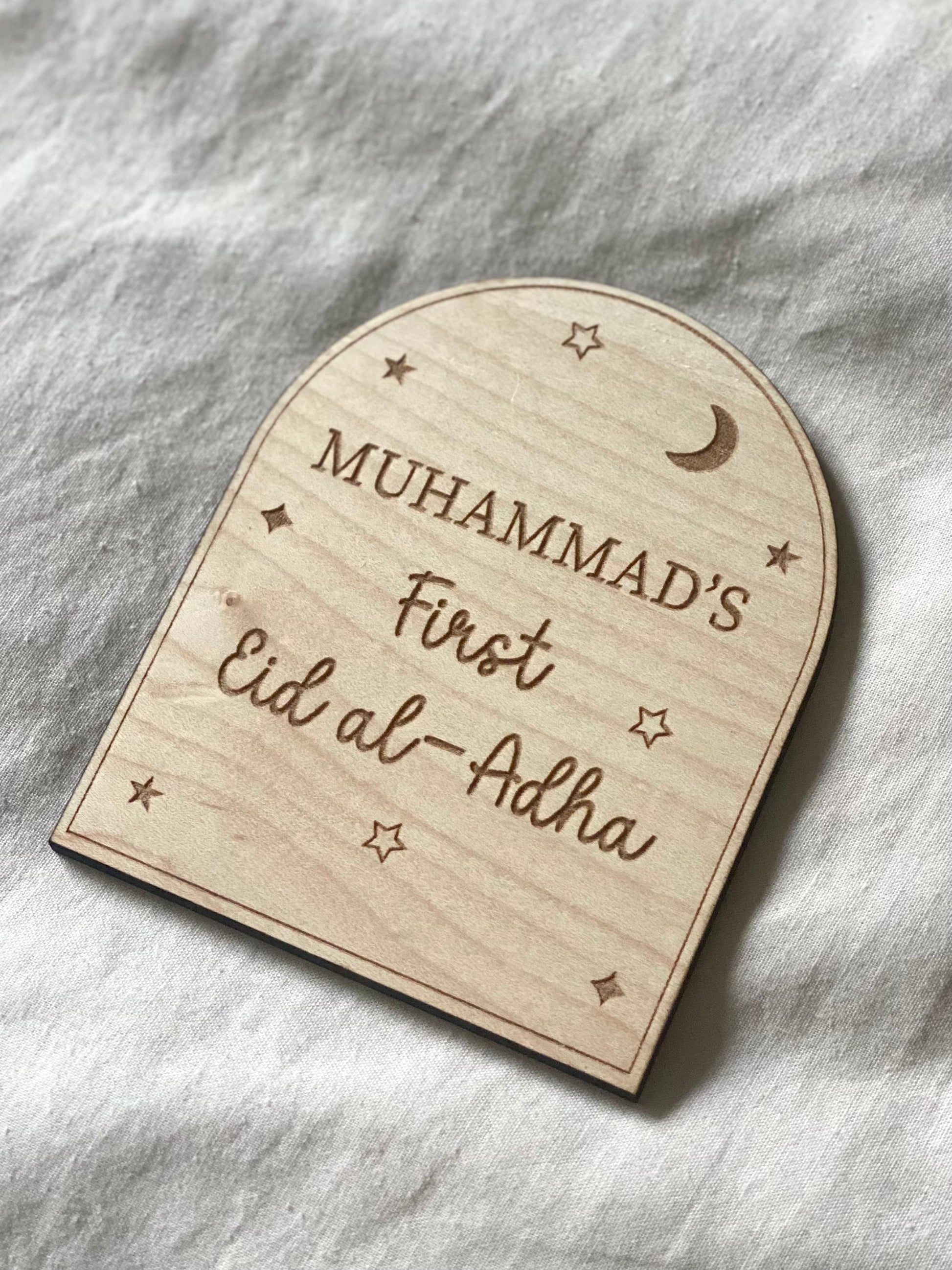 This personalised keepsake features engraved moon and star detail, “ First Eid al-Adha” text, and your child’s name – creating a simple, thoughtful piece to cherish or gift.