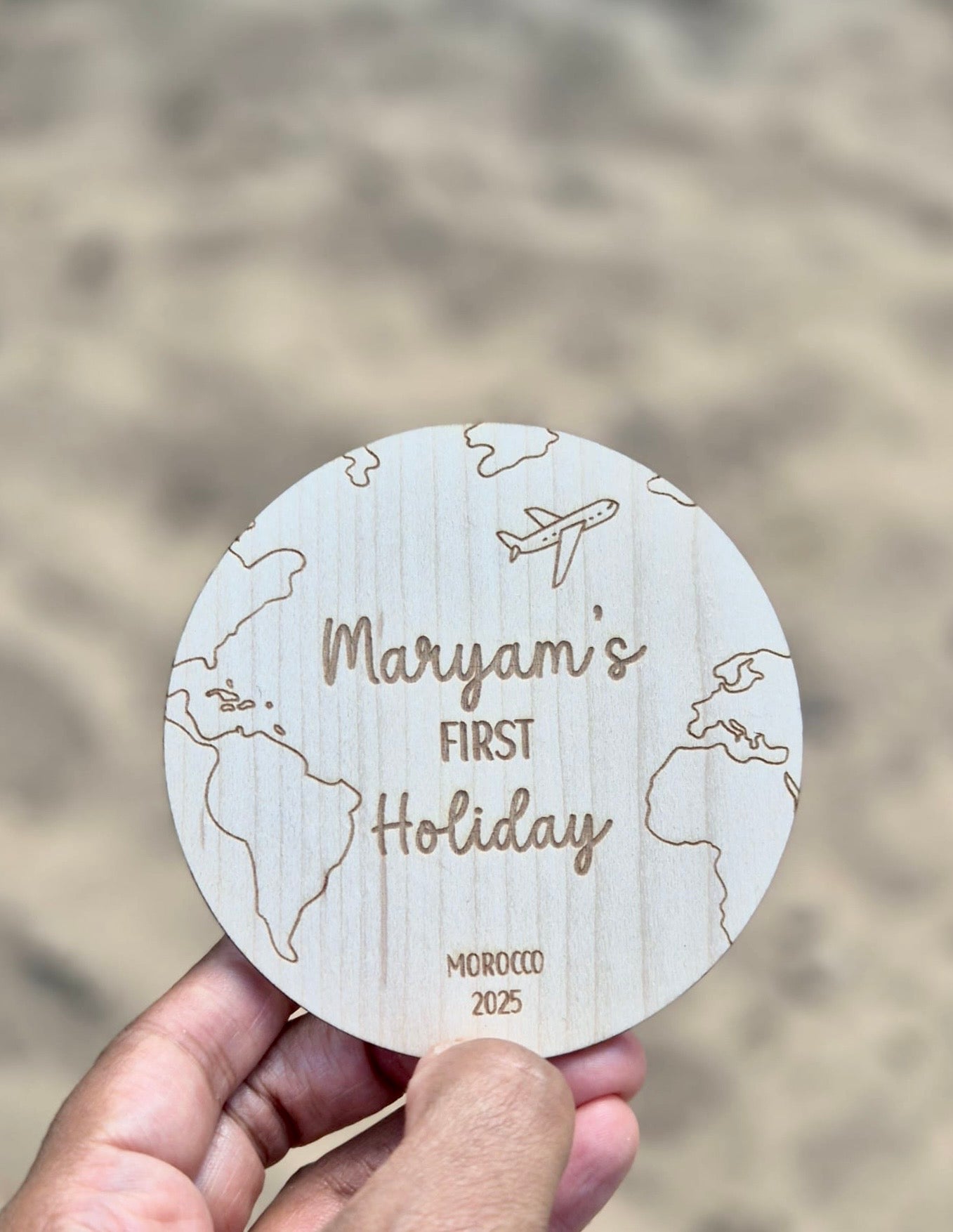 This personalised keepsake features engraved “First Holiday” text along with your child’s name, destination, and year, creating a thoughtful piece to cherish or gift.