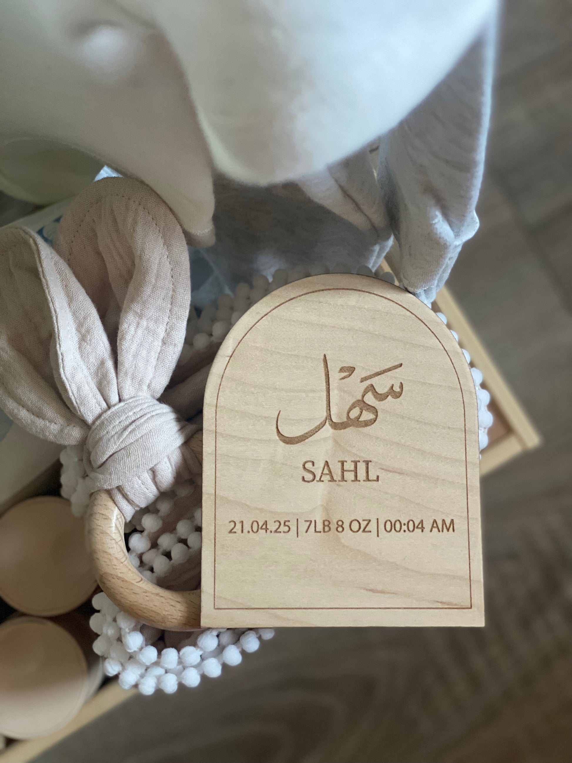 Celebrate the joyful announcement of your baby’s arrival with this beautifully engraved Wooden Birth Announcement Plaque. Personalised with your baby’s name in both Arabic and English, along with their birth date, weight, and time of arrival, all fully customisable to make it uniquely yours.
