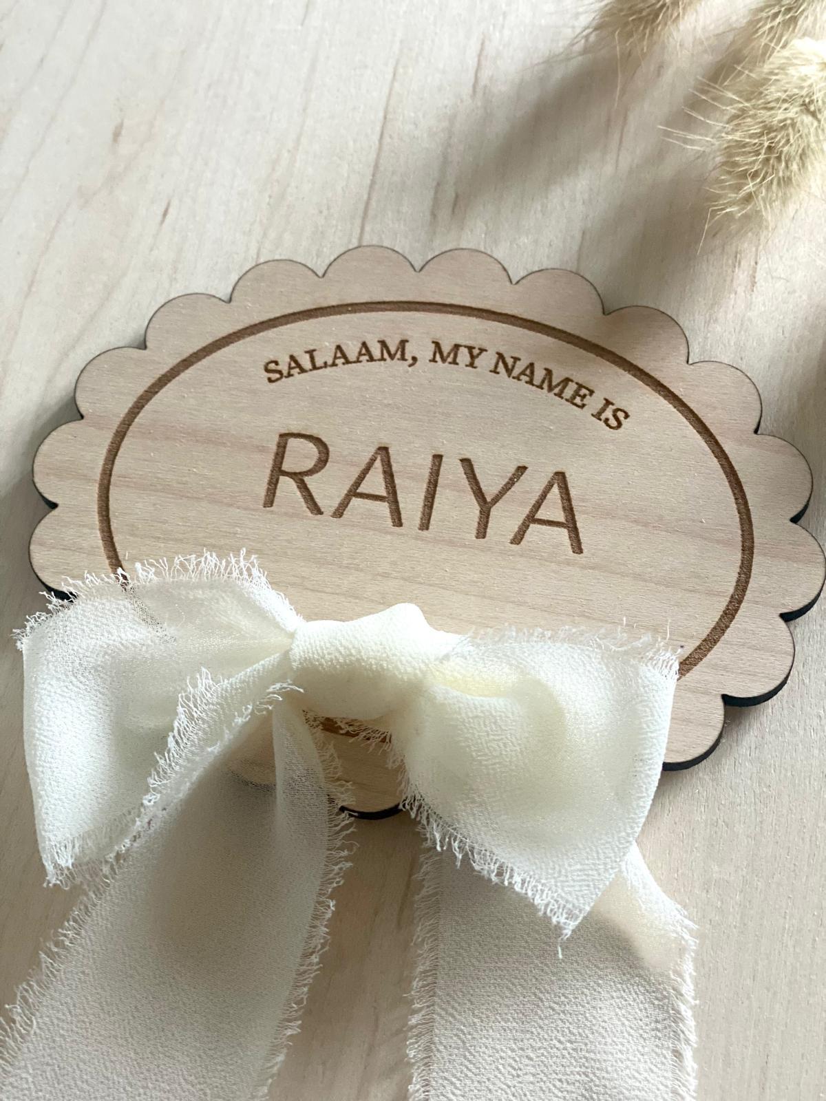Welcome your little one in the most beautiful way, with this sweetly engraved Birth Announcement Plaque. Featuring the greeting "Salaam, My Name Is" along with your baby's name. Each plaque comes with a soft cream chiffon ribbon tied into a bow, offering a warm, personal way to celebrate their arrival.